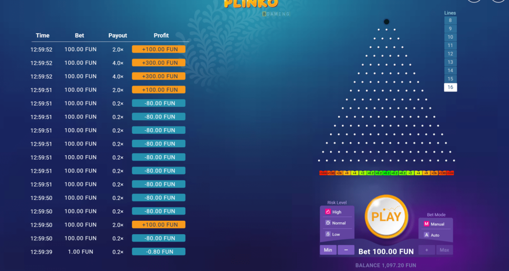 - Autoplay & Multi-Ball nutzen – Manche Plinko-Versionen erlauben automatisches Spielen oder das gleichzeitige Einsetzen mehrerer Kugeln. Damit kannst du schneller testen, ob dein gewähltes Setup funktioniert und welche Ergebnisse es bringt.